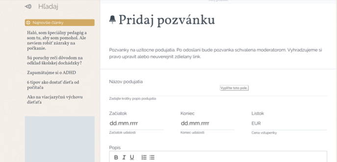Vaša pozvánka bude uverejnená na našich stránkach až po našom schválení (podmienkou schválenia je, aby obsah súvisel so zameraním našej stránky a obsahoval všetky dôležité informácie).