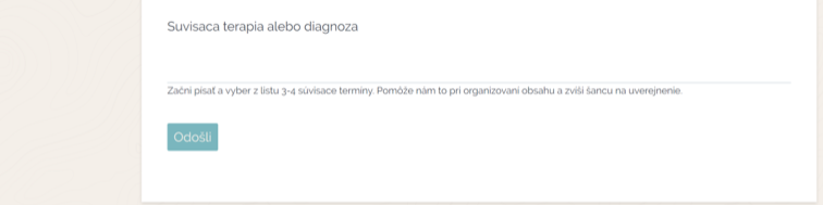 .....napokon pridajte súvisiacu problematiku (diagnózu, terapiu a pod.). Začnite písať a z vyrolovaného ponukového listu vyberte 3-4 súvisiace termíny. Pomôže nám to pri organizovaní obsahu a zvýši šancu a uverejnenie. Následne odošlite.